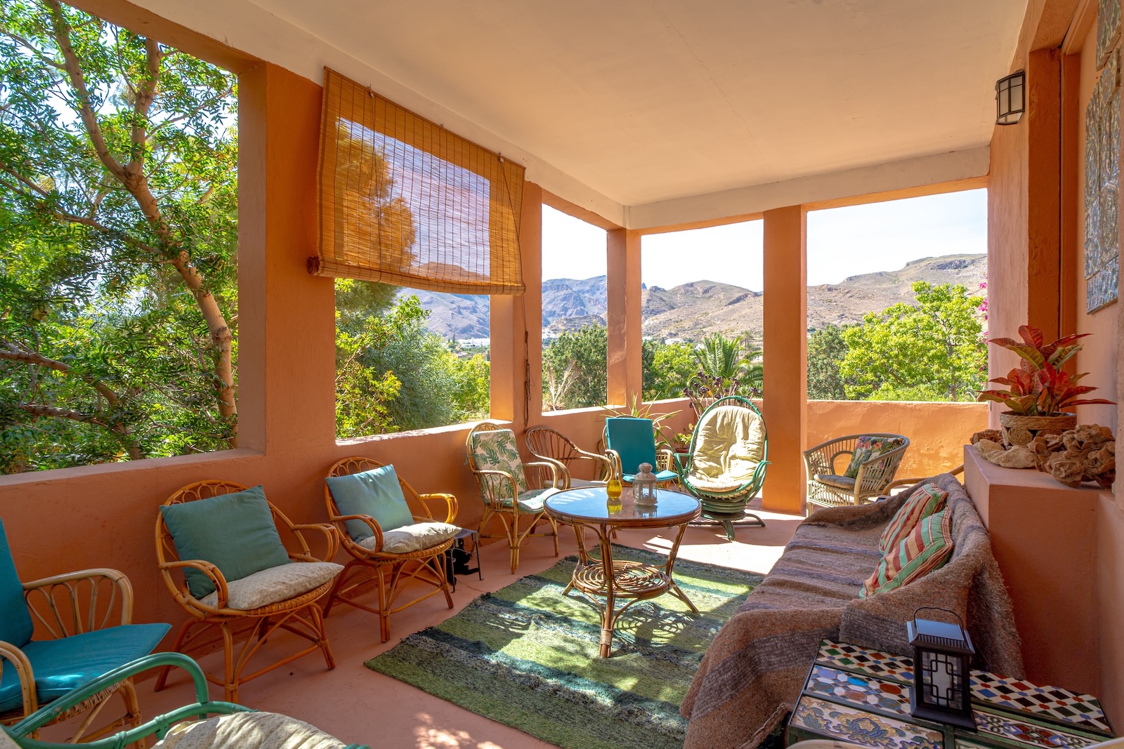 30 acres of olive and citrus groves make up this big relaxed finca, which is wonderful for a group. Inside the house, rooms are bright with tapestries, antiques and books, and a sense of airy comfort prevails. There’s air con in the bedrooms, en suite bathrooms, dining areas inside and out. There’s even a yoga studio in the grounds.